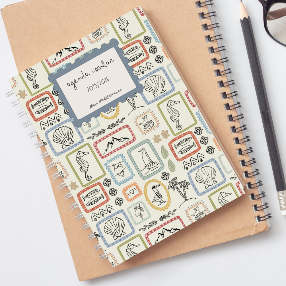 Agenda escolar que empieza en el mes de septiembre de 2024 y finaliza en agosto de 2025. Diseñada en colores mediterráneos, siguiendo la línea característica de @musamediterranea.